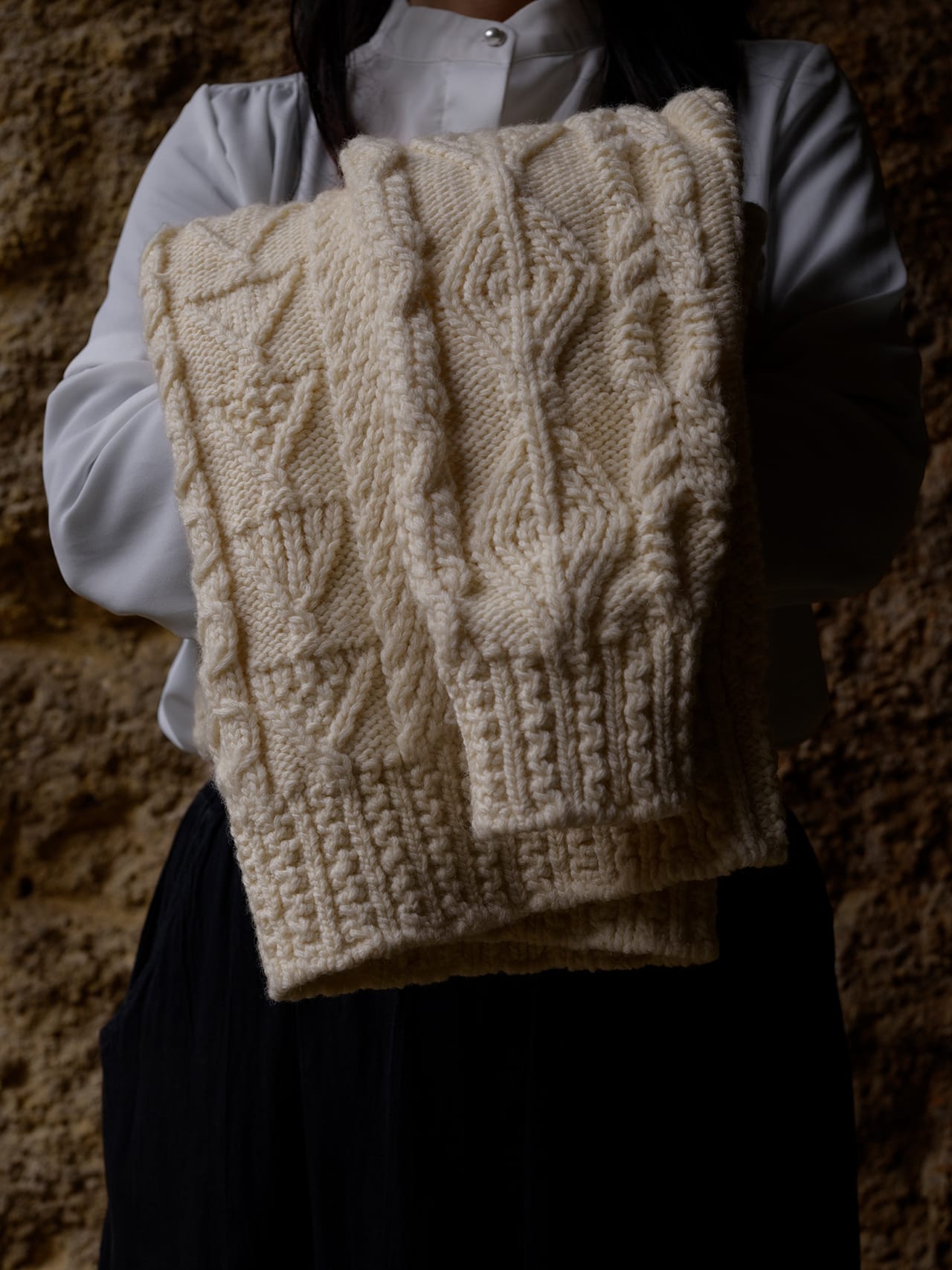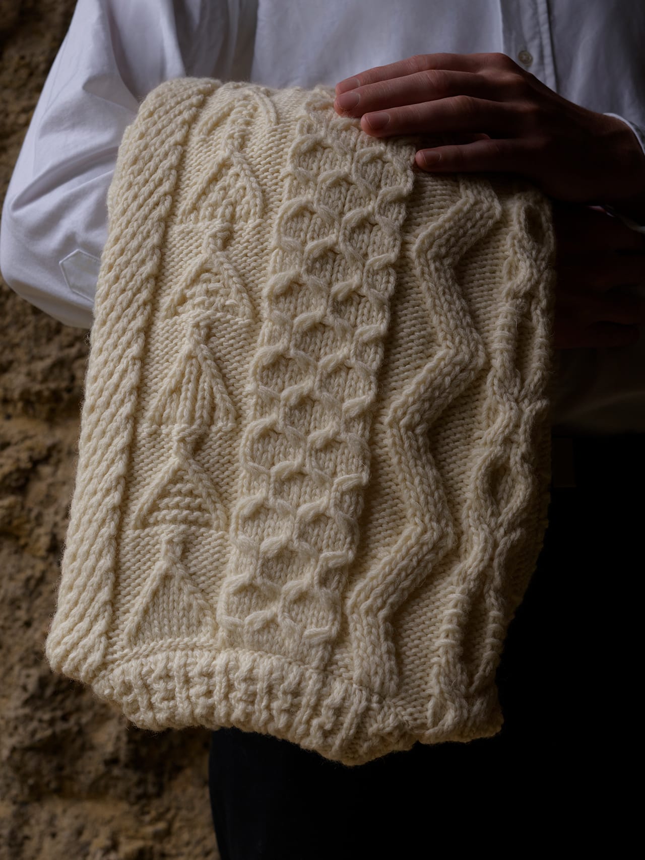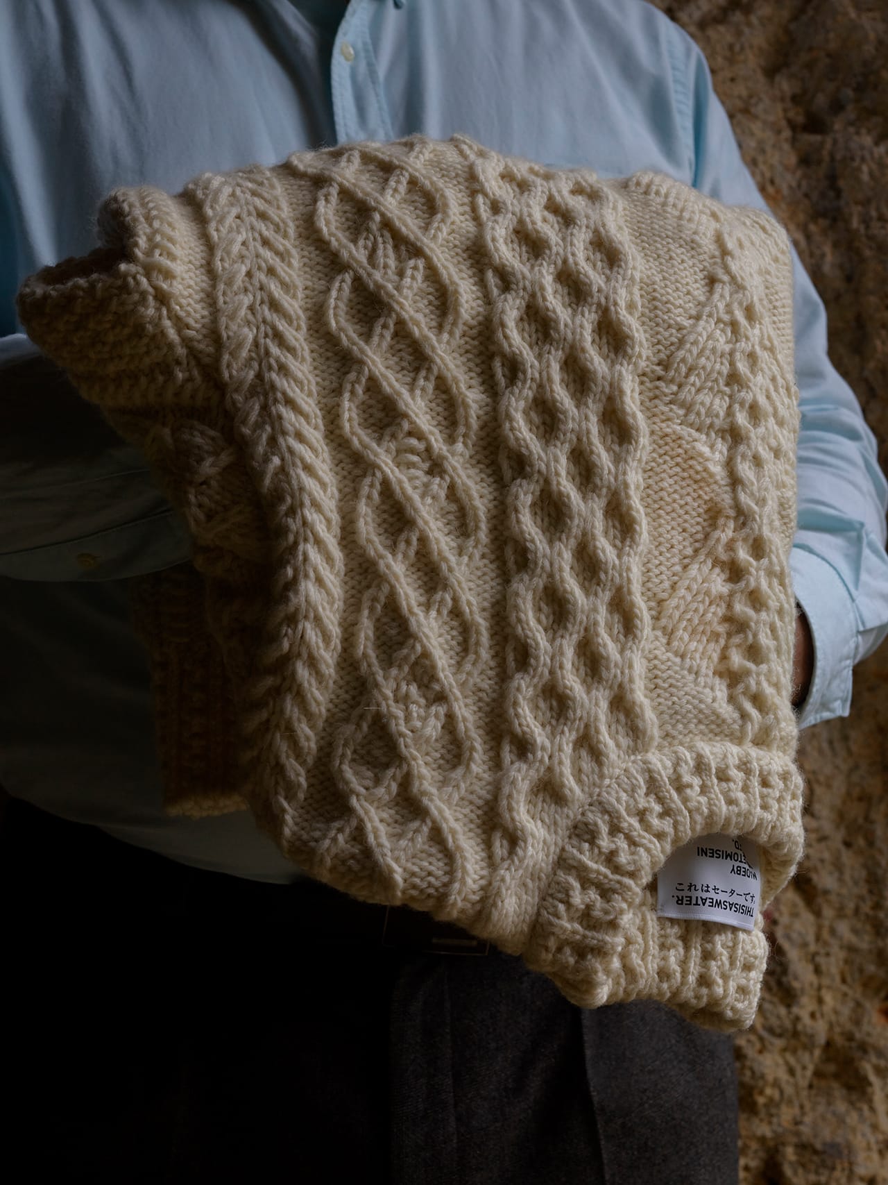 A SWEATER IS LOVE. Our sweater was inspired by what has been called “the finest Aran sweater of the 21st century,” one that encapsulates the legendary skills and devotion of the most famed hand knitter in all the Aran Islands, the late Máirín Ní Dhomhnaill. This sweater is the property of Yaichiro Nozawa, who is credited for having helped popularize Aran sweaters throughout Japan, and who travelled to Ireland to meet with Ms. Ní Dhomhnaill and personally request the knitting of this remarkable sweater. In the years that followed, it became Mr. Nozawa’s dream to somehow make this unique and extraordinary masterpiece a sweater that could be shared with the rest of the world.