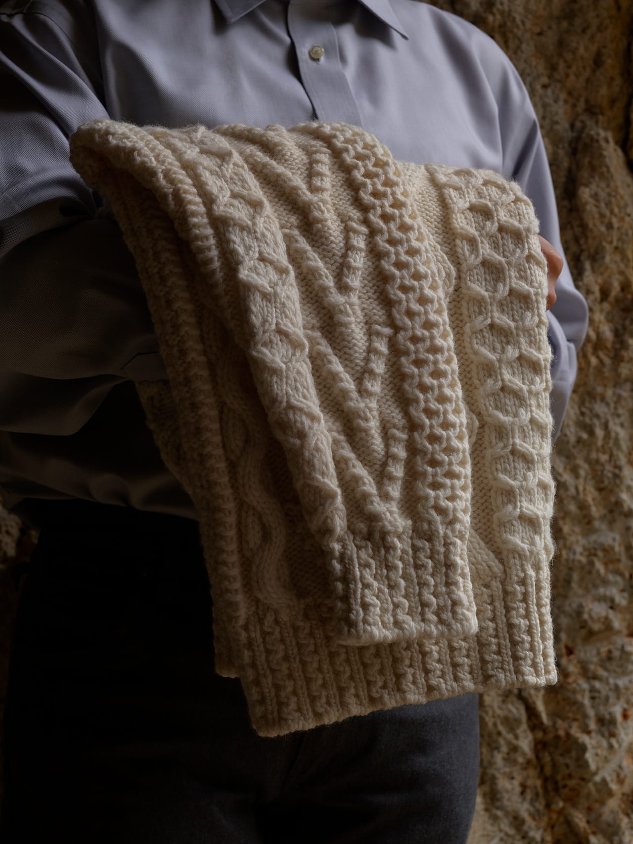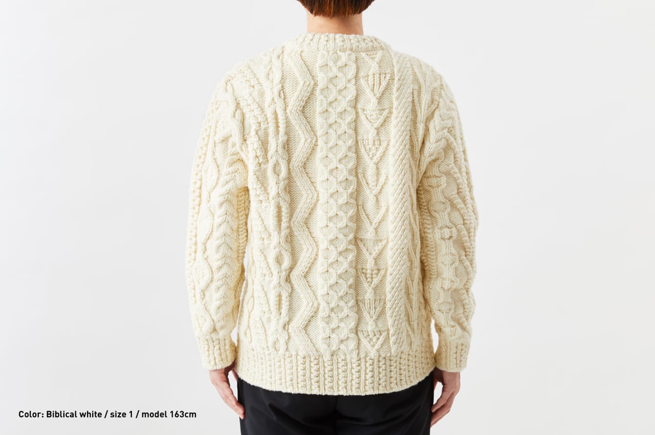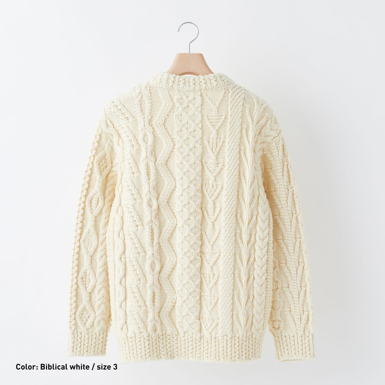 A SWEATER IS LOVE. Our sweater was inspired by what has been called “the finest Aran sweater of the 21st century,” one that encapsulates the legendary skills and devotion of the most famed hand knitter in all the Aran Islands, the late Máirín Ní Dhomhnaill. This sweater is the property of Yaichiro Nozawa, who is credited for having helped popularize Aran sweaters throughout Japan, and who travelled to Ireland to meet with Ms. Ní Dhomhnaill and personally request the knitting of this remarkable sweater. In the years that followed, it became Mr. Nozawa’s dream to somehow make this unique and extraordinary masterpiece a sweater that could be shared with the rest of the world.