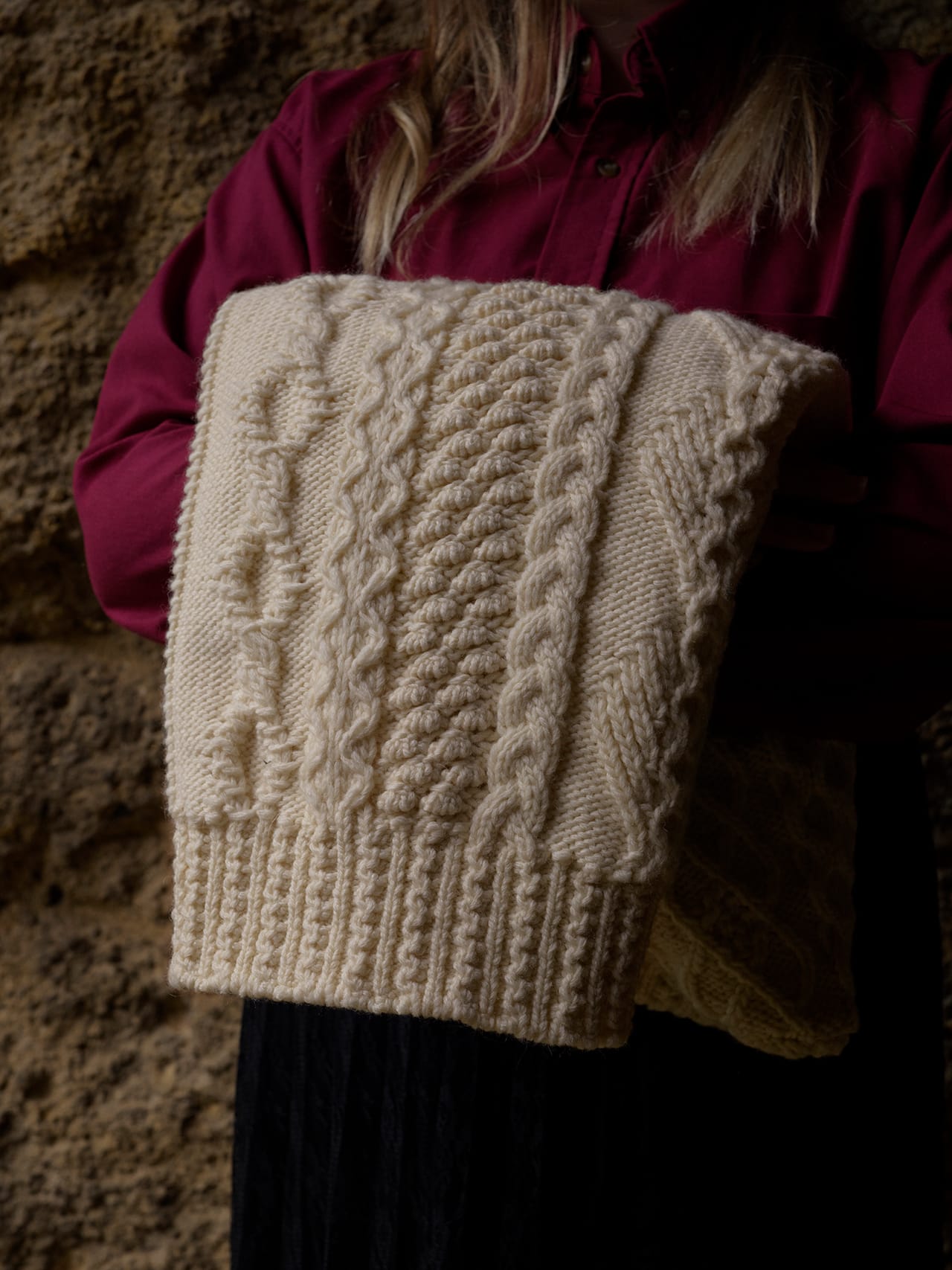 A SWEATER IS LOVE. Máirín Ní Dhomhnaill was a legendary knitter who became world famous when she presented one of her hand-knit sweaters to Pope John Paul II in 1981. Born on Inis Meáin, one of the three Aran islands, she began to learn the art of knitting at the age of 6 by watching and imitating her mother, and her talent was later discovered by Pádraig Ó Síocháin, an Irish journalist and entrepreneur who would help to pioneer the sales of Aran sweaters around the world. Her life revolved around the creation of beautiful, hand-knit items until her death in 2020 at the age of 85, and she is remembered for stating that “Aran sweaters do not come from technical skills, but from the heart.”