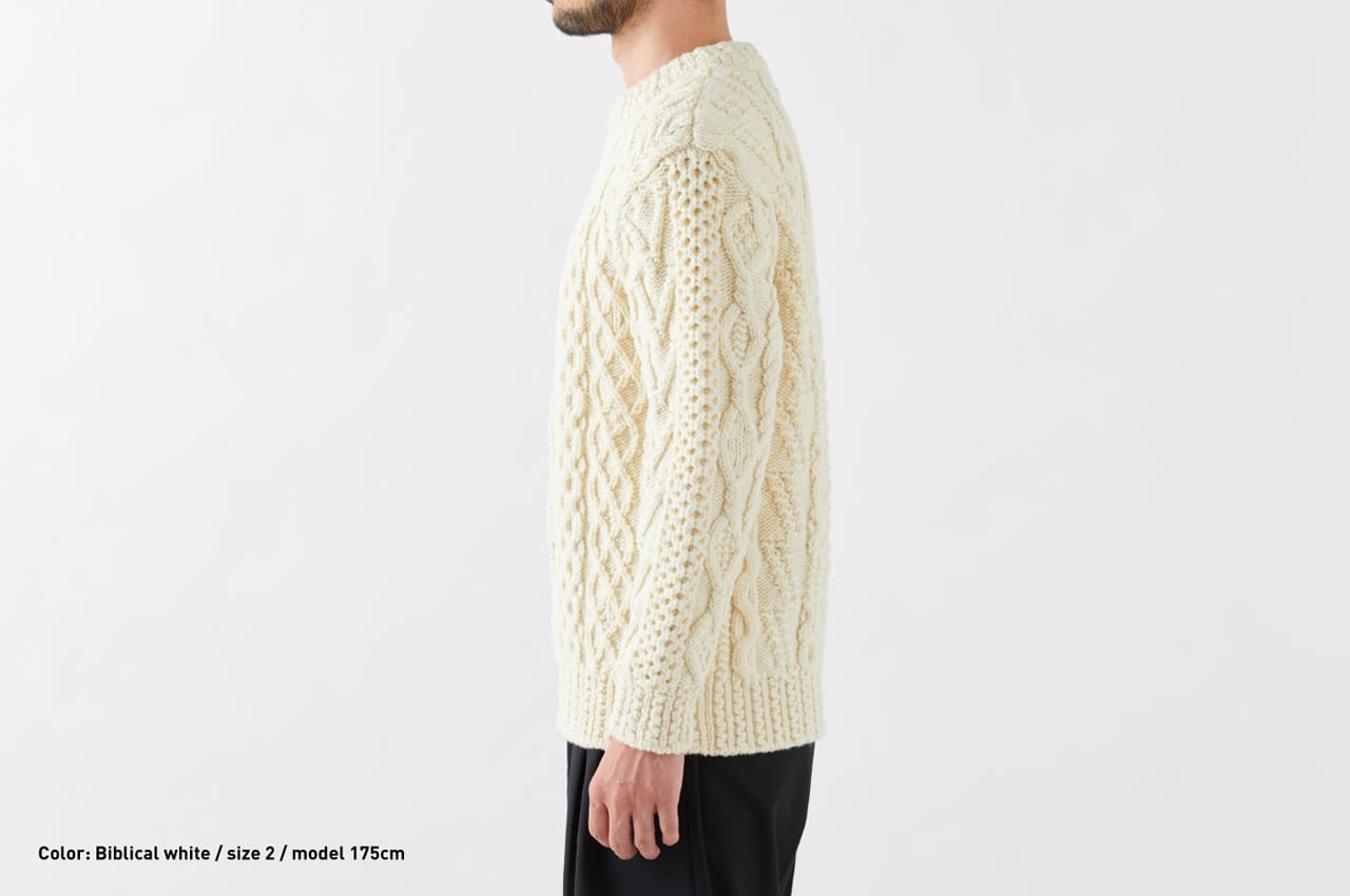 Our THIS IS A SWEATER brand delves into the heart of what a sweater really is, and this time we sought to knit an Aran sweater which remains faithful to the history, traditions and narrative of the region, but which also suits our contemporary lifestyle. Our efforts culminated in a sweater that features a classic Aran look but is soft and gentle enough to be worn over a short-sleeved shirt without being itchy or irritating, even for those with delicate or sensitive skin.