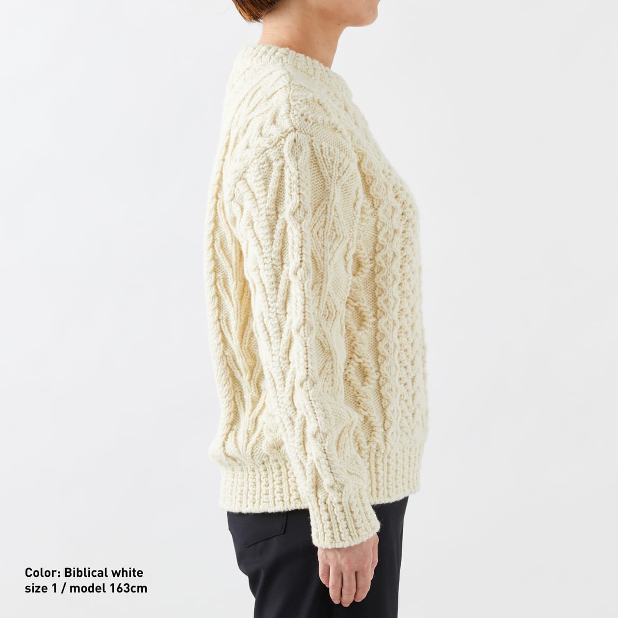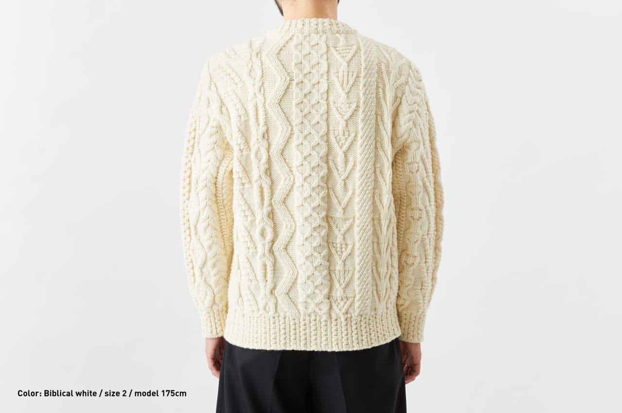 A SWEATER IS LOVE. Because without love, this Aran sweater would never have come into existence. If you look carefully, you can see that this sweater in fact features 30 separate patterns, each exquisitely crafted and uniting to create a sweater of unsurpassed beauty. A sweater like this is not merely made possible by the most advanced knitting techniques, but also requires a remarkable amount of time and dedication. In other words, it would not be possible without the unstinting love of a knitter willing to devote so much effort on behalf of the person who would wear her creation.
