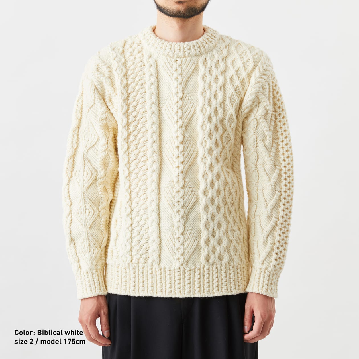 A SWEATER IS LOVE. このセーターは 「アラン諸島最高のハンドニッター」と称された故モーリン・ニ・ドゥンネルが自らの技と情熱のすべてを注いで編みあげた「21世紀最高のアランセーター」を見本としています。所有者である野沢弥一郎氏は、日本にアランセーターを広めた第一人者で、アイルランドの彼女の元を訪れ、その傑作を編んでもらいました。やがて、この世にたった1枚しか存在しないそのセーターの神々しいまでの見事さを後世に伝えたい、というのが野沢氏の望みとなりました。